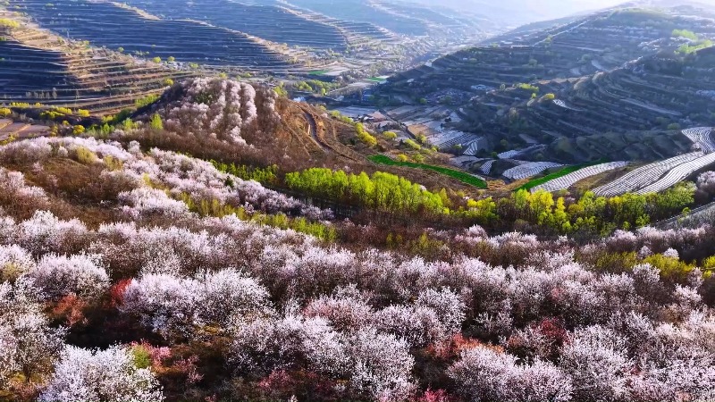 杏花“云雾”与梯田曲线“温柔相拥”