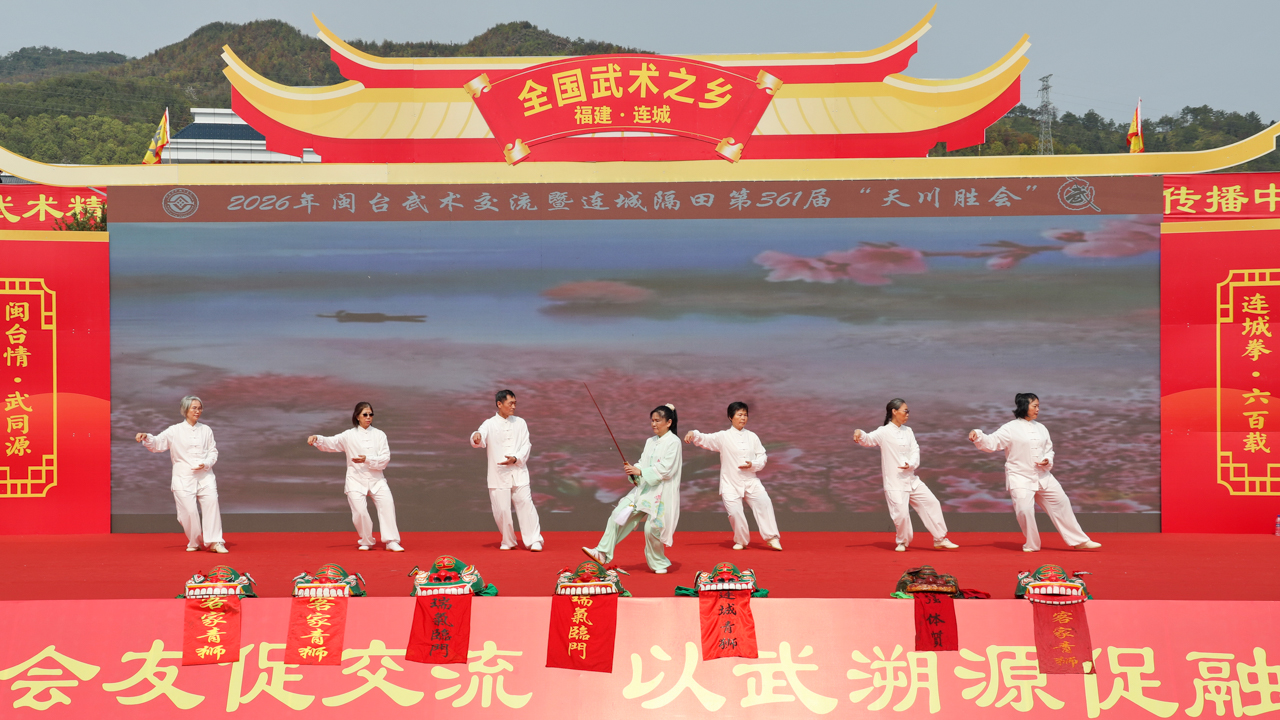 央视网消息 3月8日,龙岩市连城县2026年闽台武术交流活动暨隔田村第361届“天川胜会”非遗民俗文化活动举行。活动以“武承古韵连两岸 情聚同心续锦程”为主题,来自福建、江西、广东、台湾等地以及新加坡武术爱好者跨越山海,齐聚一堂,以武会友、共续文脉。